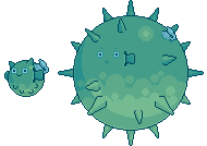 They become much much larger in their inflated appearance, being a green sphere with many spikes of varying sizes poking out all over. Visible in the middle of the inflated pufferfish are its eyes and mouth, but this time frowning. Nearby are its two ears and fins, which are hard to notice due to their spike-like appearance.